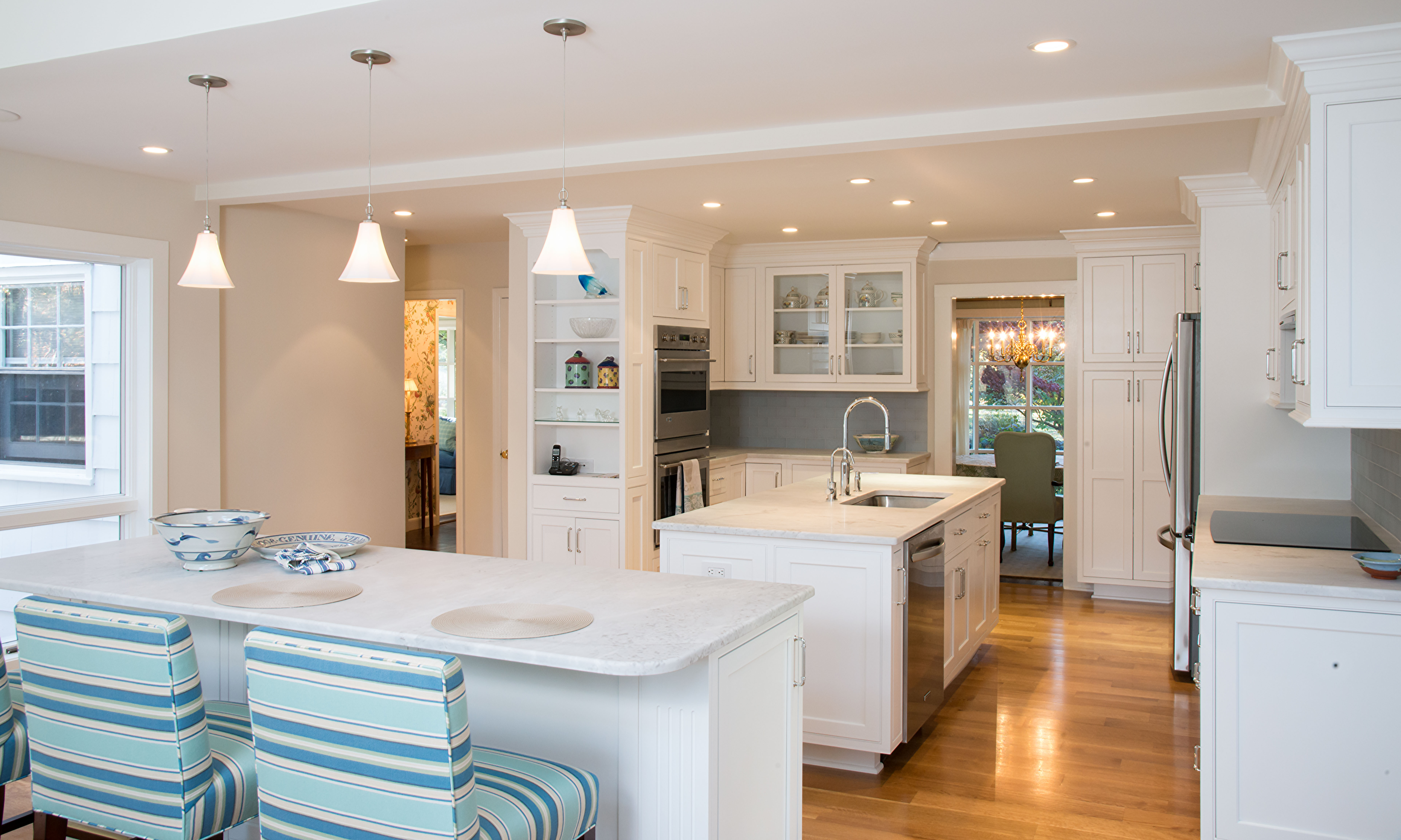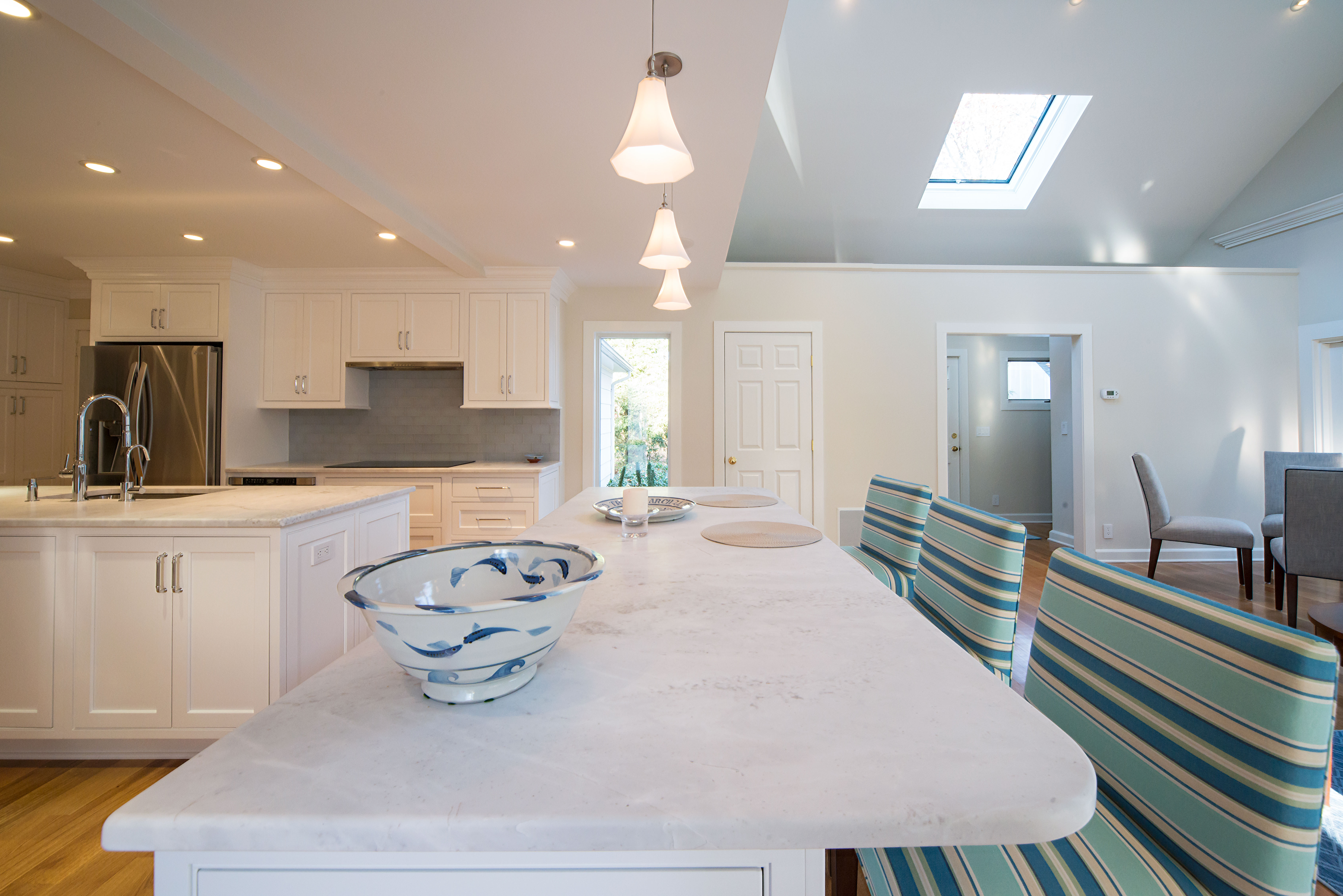 Another view of the kitchen showing both islands. The ceiling beam above, 17 feet long, replaced the old kitchen wall and provided the needed support to expand the kitchen into the adjacent family room.