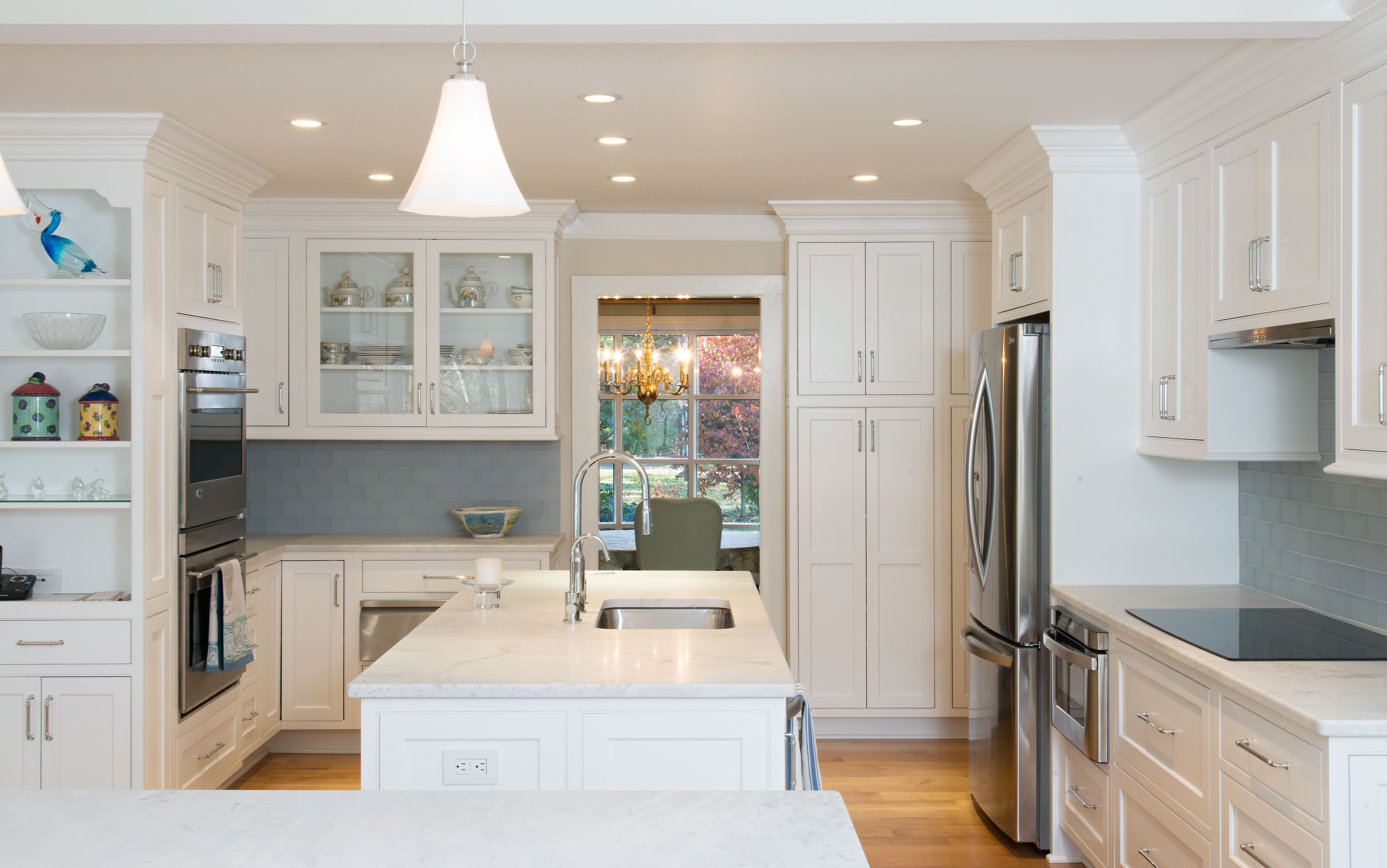 The combined talents of Ring’s End Kitchen & Bath Designer Jan Allen, Bryan & Brian Construction Company, and Susan Gregory Interiors turned the Robinson family’s small dark kitchen into a beautiful, open and airy space that connects the expanded kitchen to the family room. As with most renovations, this one was not without a challenge. A support beam needed to be installed to replace a wall that divided the space. Drain pipes and electrical wires were successfully rerouted for a fabulous end result!