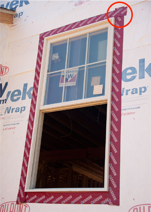 Once the flanges have been correctly applied, attach a self-adhesive flashing tape on the outside over the house wrap. Always have the layer above overlap the layer below. Apply the side jamb flashing tape first, then the head flashing tape second. Use building tape to seal the top of the head flashing tape, so you’ll have two layers of tape at the top of window. Bring the flap of moisture resistant barrier that was cut earlier in the process down over the top of the head of the window for one final layer of protection at the top. The top of the window is where it’s most prone to moisture damage, so you want to make sure it’s thoroughly protected.