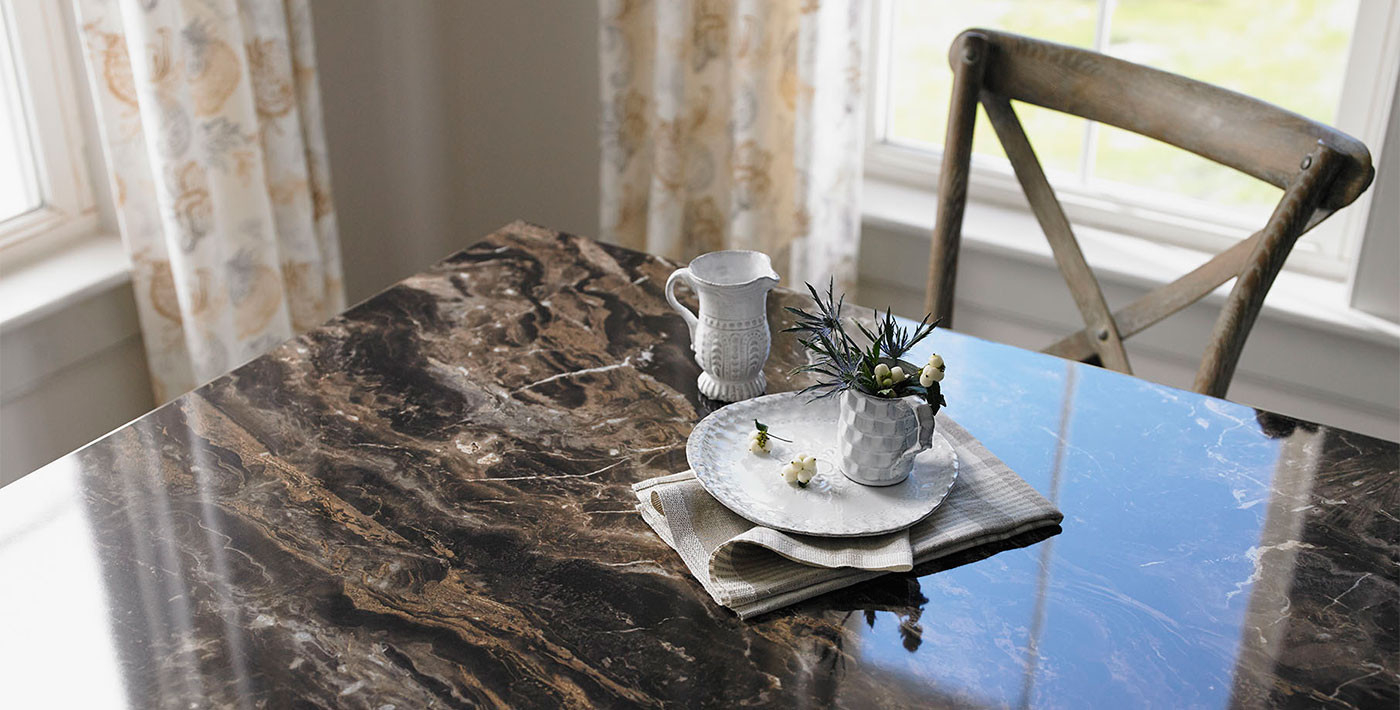 Commonly known under brand names like Formica and Pionite, laminate is affordable, easy to maintain, and relatively durable. It’s composed of pressed, bonded paper and resin; it comes in a huge variety of colors and patterns. Laminate innovations include more wear-resistant surfaces, expanded edge profile options, and updated textures and finishes.
