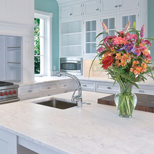Quartz is the most popular type of engineered stone countertop. It combines the beauty and durability of natural stone with new technology for a product that is non-porous, sanitary, and virtually maintenance-free. Made from crushed quartz, resin, and pigment, quartz countertops are available in a wide range of colors and patterns, from those that mimic natural stone to fresh contemporary palettes. Ring’s End carries quartz counters by Caesarstone, Cambria, and Zodiaq.