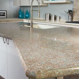 Our in-house custom countertop shop can make you a new kitchen or bath countertop from solid-surface Corian or from Formica, Wilsonart, Pionite, and Nevamar brand laminates. Chose from thousands of colors, custom edge treatments featuring bevel laminate and hardwoods, and angled or radius corners. Have one of our Kitchen & Bath Specialists show you the possibilities.