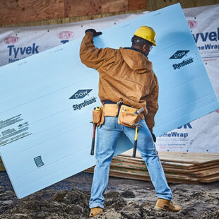 Home Slicker by Benjamin Obdyke is a ventilating and self-draining rainscreen offering a thermal break and moisture protection for sidewalls. Its unique three-dimensional Nylon matrix provides a continuous space for drying, allowing moisture to escape quickly before it can cause sidewall damage.