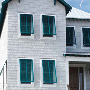 Inspired by the tropics, Bahama shutters [sometimes called Bermuda shutters] consist of louvered panels that are hinged at the top so the shutters open outward from the bottom. They look wonderful on almost all seaside homes.